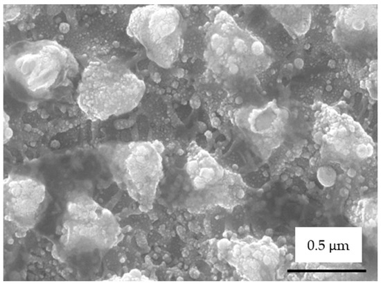 A SEM micrograph at high magnifications of the more ordered sample, CrN, at S3500-Hd3 conditions reveals a spherical structure between 50 and 200 nm, as seen in Figure 7. Even though the femtosecond laser is a cold laser due to the short pulse, these spheres show signs of micro-fusion of the material. SEM images of all samples were produced but they did not reveal any relevant information for patterning issues. Shimizu et al. [26] observed a decrease in the formation thresholds of high-spatial-frequency LIPSS (HSFL) and low-spatial-frequency LIPSS (LSFL) with the increased irradiated laser spot size. For smaller laser spot sizes, HSFL was only formed at the periphery of the LSFL formation area, whereas for larger spot sizes, HSFL was randomly distributed within the laser spot. Their results are coincident with the hypothesis that the existence of defects in crystal contributes to the early stage in the formation of LIPSS, in which the electron excitation via one- or two-photon absorption in a defect site causes local nanoablation at a laser fluence below the intrinsic ablation threshold, followed by the formation of a nanovoid, which acts as a scatterer, and the interference of scattered wave and laser pulses leads to HSFL formation.