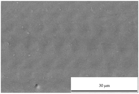 DLC and laser conditions S3500-Hd10 (Sp 3500 mm/s, lateral overlap 10 µm, and fluence F 3.1 J/cm2) were chosen to achieve a depth of 0.51 µm within the DLC layer. In this sample, it was found that surface roughness decreased from the original sample (100 nm). With these conditions, the polishing of the sample was reduced to a Ra of 15.20 nm. The rest of the substrates did not show similar characteristics, just a progressive loss of order but similar to the ones shown in Figure 5 and Figure 6. Please note that other samples, as the one shown in Figure 6, provided values of Ra over 100 nm. Figure 8 shows SEM image laser machining on DLC with low roughness.