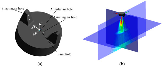 Table 1 shows the properties of the fluid phases involved in this study, concerning liquid paint and air. The paint hole (shown in Figure 2a) was set to be a paint mass inlet, where the value of mass flow rate was 1.32 × 10−3 kg/s, and the turbulent intensity and hydraulic diameter were given as 5% and 1.1 mm, respectively. The atomization air hole, the assisting air hole and the shaping air hole were set to be air pressure inlets having pressure values of 110 kPa, 110 kPa, and 150 kPa, respectively. The workpiece and the nozzle (shown in Figure 3) were set as wall boundaries. The contacting faces (such as the face where the static part and the translational part contact) were set as interfaces. Moreover, other faces were set as outlets.