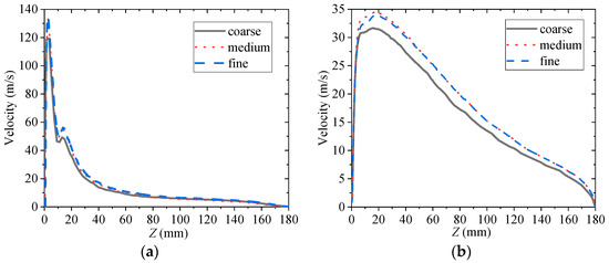 Gas (a) and liquid (b) velocities along the Z-axis for the simulation of the 90-degree arc connecting surface with different sets of meshes.