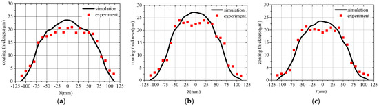 Comparison between the experimental and simulated coating thickness distributions on different sections of the surface with an angle of 90 degree. (a) section A; (b) section B; (c) section C.