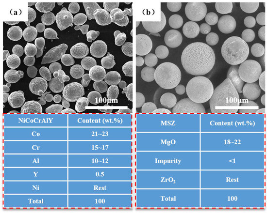 The NiCoCrAlY and MSZ raw powders used in this paper were supplied by Beijing General Research Institute of Mining and Metallurgy (BGRIMM Co., Ltd., Beijing, China). The micro-morphologies and compositions of the two spraying powders are shown in Figure 1, where it can be seen that the powders were nearly spherical, and the size fraction was sieved to 20~80 μm. The fluidities of the NiCoCrAlY and MSZ powders were 27.5 s/50 g and 33.6 s/50 g, respectively, which can ensure the stability of powder feeding in the spraying process. 30 CrMnSiA alloy steel substrates (φ 25.4 mm × 6 mm) were used for the NiCoCrAlY/MSZ coatings, and their specific composition is shown in Table 1.