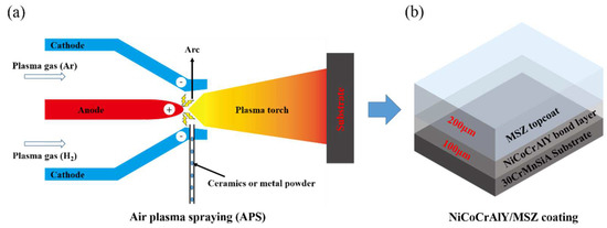Preparation method and the structure of the NiCoCrAlY/MSZ thermal barrier and anti-ablation coating: (a) sketch of the air plasma spraying techniques used for fabrication of NiCoCrAlY/MSZ coating; (b) schematic diagram of the structure of the NiCoCrAlY/MSZ coating.