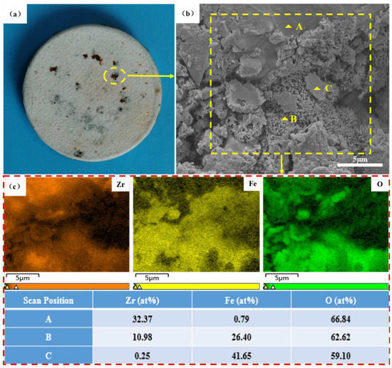 Figure 5 shows the surface morphology and composition distribution of the corrosion area of the N-6 coating sample. As shown in Figure 5b, there are three different microstructures in the macro-corrosion zone: dense and uniform zone A, divergent villous zone B and smooth lamellar zone C. According to the EDS results (Figure 5c), zone A mainly consisted of zirconium (32.37 at.%) and oxygen (66.84 at.%), so it is considered the original MSZ coating structure without corrosion. In zone B, the zirconium content decreased to 10.98 at.%, and the content of iron increased to 26.40 at.%. Combined with the loose microstructure shown in Figure 5b, it can be speculated that the increase in iron content was due to the corrosion products that overflowed out of the coating. Therefore, zone B was a mixture of MSZ and FexOy corrosion products. As for zone C, the zirconium almost disappeared; it was only composed of iron and oxygen. As a result, this zone was composed of FexOy corrosion products produced by the 30 CrMnSiA substrate during the NSS test.