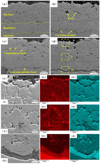 Figure 11 shows the damage behavior of the NiCoCrAlY/MSZ composite coating in the neutral salt spray environment. As shown in Figure 11a,b, due to the low density of the MSZ coating, H2O, O2, chloridion (Cl−) and other corrosion media infiltrated into the BC along the corrosion channels consisting of pores and cracks, and then they reacted with Cr, Al and other active elements to form dense oxidation protective films, which can effectively inhibit the infiltration of H2O and O2 and slow down the corrosion process. Additionally, the NiCoCrAlY bond layer consisted of γ-NiCoCr and β-NiAl, which have close corrosion potentials; therefore, NiCoCrAlY exhibited high corrosion resistance due to a homogeneous alloy composition without forming a macro-galvanic cell in the neutral salt spray environment [14,35]. However, with the characteristics of a small radius and a strong penetration ability, Cl− was able to preferentially adsorb on the passivation films, displace the oxide ion (O2−) and eventually create a large number of active sites [36]. As a result, corrosion media could enter the substrate through the active sites and cause the redox reaction [37] shown in Equation (2) with the 30 CrMnSiA substrate; thus, corrosion products formed, and corrosive pitting gradually appeared.