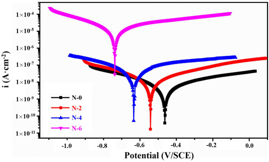 The potentiodynamic polarization curves of the NiCoCrAlY/MSZ composite coating samples before and after the different cycles of the NSS test are shown in Figure 7. The specific relevant electrochemical parameters obtained using the Tafel extrapolation method are shown in Table 4. It can be seen that N-0 had the maximum corrosion potential (−0.4516 V) and the lowest corrosion current density (5.6 × 10−9 A·cm−2), indicating that it exhibited the best corrosion resistance and can provide effective protection for the substrate. With the increase in salt spray time, the polarization curves changed obviously, the corrosion potential decreased, and the corrosion current density gradually increased. When the salt spray time was less than 192 h, the corrosion resistance of the NiCoCrAlY/MSZ coating sample declined slowly. The anode Tafel slope (ba) and corrosion potentials of N-2 and N-4 were close to those of N-0, and the anode polarization rate was also uniform; the corrosion current densities of N-2 and N-4 were only 1.2 × 10−8 A·cm−2 and 2.2 × 10−8 A·cm−2, respectively. The reason for this phenomenon was that the NiCoCrAlY BC can form dense oxidation protective films, such as Cr2O3 and Al2O3, at the initial stage of the corrosion process [14], which inhibited the further infiltration of the corrosion medium.