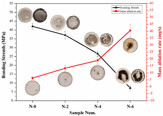 The testing results of the bonding strengths and anti-ablation properties of the coatings before and after the NSS test are shown in Figure 8. With the increase in the salt spray time, the bonding strengths of N-0, N-2, N-4 and N-6 decreased significantly, reaching 42.0 MPa, 37.1 MPa, 26.5 MPa and 7.2 MPa, respectively. Combined with the tensile fracture morphology, it can be found that the fractures of N-0 and N-2 mainly occurred at the interface of the TC and BC due to the difference in the coefficient of thermal expansion. For N-4 and N-6, obvious corrosive pitting occurred and overflowed from the substrate, and loose corrosion products led to a mismatch in mechanical occlusion between the BC and the substrate. Therefore, the fracture positions of the two coating samples occurred at the BC–substrate interface.