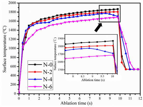 Combining Figure 8 and Figure 9, the coatings of N-4 and N-6 peeled off in advance during ablation; the exposed substrate made direct contact with the high-temperature and high-speed OAF. Accordingly, the surface temperature drops of N-4 and N-6 were due to the endothermic melting of the substrate. Moreover, the spalling time of the coatings can be characterized by the trend of the surface temperature curves. As shown in Figure 9, when the ablation time was 1 s, the surface temperature of N-6 began to fall below that of the others, indicating that the coating had peeled off at the initial stage of ablation, which means that it cannot provide effective protection for the substrate. For N-4, the surface temperature slightly decreased as the ablation time reached 8.5 s, suggesting that the coating was damaged at this time.