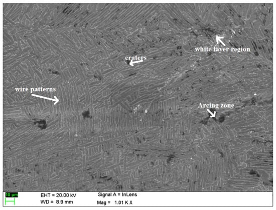 - The patterns of the wire electrodes are visible with specimens with negligible recast white-layer region, craters, and arcing region.