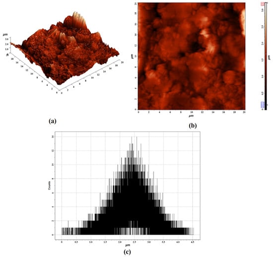As shown in Figure 6, the surface topography was investigated using AFM under the optimal input factors in WEDM. The three-dimensional analysis showed that the lower peaks and valleys were observed over the machined surface as compared with trial 26. The histogram analysis proved that a higher occurrence of lower surface roughness points was observed over the machined surface than the surface obtained with the process factors of trial 26 in the WEDM process. Figure 7 shows the SEM-based surface morphology under optimal factors in the WEDM process. The melted particles are resolidified over the machined surface, which can be termed a white-layer thickness. The thickness of the layer can affect the surface quality of the specimens [46]. It was observed that only a little thickness of resolidified thickness was observed over the machined surface.