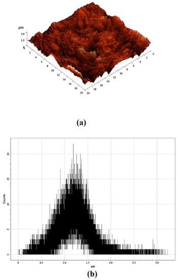 Surface morphology analysis of machined specimen under optimal process factors: (a) Three-dimensional view and (b) Histogram analysis.