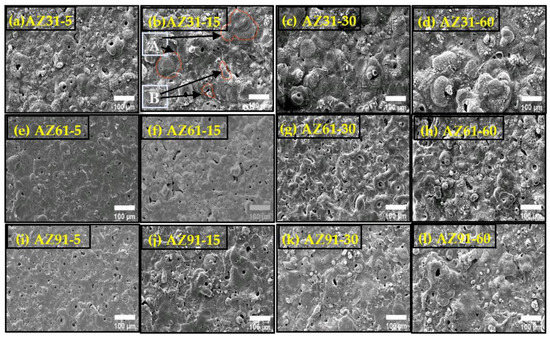 The surface of the coated samples can be seen in Figure 1a–l. Two major zones (a) crater region and (b) clusters of incomplete craters and nodular structures, as described in detail previously, can be observed on the surface (Figure 1b) [41]. Craters are the circular areas as indicated by “A” with a hole in the middle, created by strong, however uniform microscopic discharges. The nodular structures as indicated by “B” are the patches and regions around the boundaries of craters as marked in Figure 1. In the case of AZ31, which offers a large number of active sites to the anodization process crater-based morphologies are found to form due to the uniform and high number of discharges at the active sites as shown in Figure 2. However, as the Al-contents increase, the number of active sites decrease. Thus, intensive yet impulsive discharges occur due to higher energy outburst at localized sites including Mg-Al phases, which contribute toward dendrite formation. On the contrary, a combination of dendrites and craters formed at longer processing times, as shown in Figure 1l. The morphology and size of the craters, as well as their ratio relative to the nodular structure, vary and depend on processing conditions. The size of the craters increase with processing time as described by the kinetic equation of grain growth [42].
