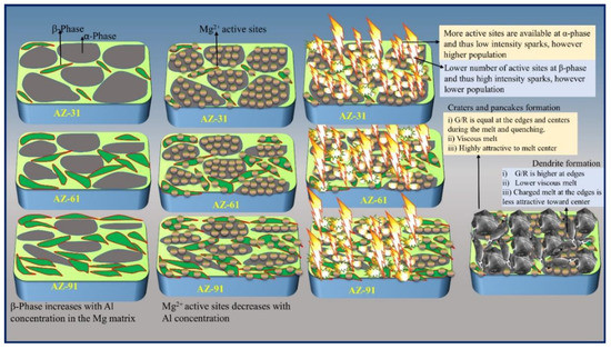 Magnesium and its alloys are in high demand in multiple high-tech industries, such as aerospace, electronics, biomedical, and the automobile industry, due to physical and electronic properties, such as low density, thermal conductivity, electrical conductivity characteristics, vibration damping, and blocking of electromagnetic waves [1,2,3,4,5,6,7]. Among the Mg alloys, AZ series alloys are well-known for their abundance, general purpose use and reasonable material cost. However, corrosion continues to be a great concern and a main issue affecting the implementation of all of these alloys [8,9,10]. Fundamentally, the AZ-series alloys (Mg-Al-Zn) have two main crystallographic phases: the “α” phase, and the “β” phase (Mg17Al12); both are intermetallic compounds [9,11,12,13,14]. The primary “α” and the eutectic “β” phases have different electrochemical behaviors, depending on their different aluminum contents [15,16,17]. Thus, to understand the nature of corrosion of these AZ-series alloys, the role of “α” and “β” phases must be considered and explored, as previously presented and discussed [18,19,20]. For instance, various researchers explored the anti-corrosion role of “β” phase in AZ91 [13,21,22], and whether the β-phase could act as an inert corrosion barrier [23,24]. However, there also exists the opposite opinion which states that Mg17Al12 precipitates, due to their cathodic nature with respect to the α matrix, could be detrimental for the overall corrosion resistance [25]. For instance, Song et al. [26] measured the individual polarization curves for “α” and “β” phases in 1 N NaCl solution, and observed that the corrosion current density obtained from the “β” phase was much lower than that of the “α” phase. This finding led these researchers to the conclusion that the “β” phase was very stable in NaCl solutions and that it was inert to corrosion. However, due to the cathodic nature of the “β” phase, it could be an effective cathode for the “α” matrix. Thus, it was suggested whether “β” phase could serve as a galvanic cathode, causing accelerated corrosion of the “α” matrix, conditioned to small volume fraction. On the contrary, the higher “β” phase volume-fraction could cause a superior anodic barrier regime to inhibit the overall corrosion of the alloy, because in this case corrosion is limited to occurring on the “α” phase surface area [27,28].
