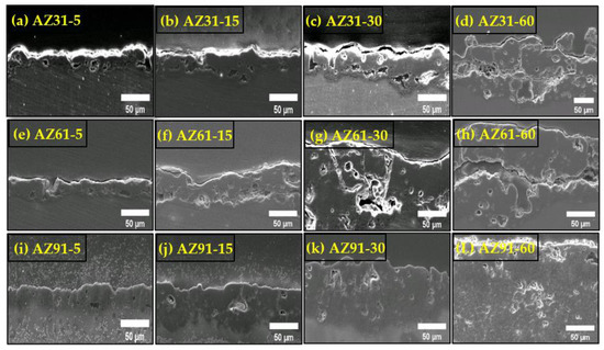 Cross section morphologies of the coated sample (AZ31, AZ61, AZ91) obtained at different processing times. (a) AZ31-5; (b) AZ31-15; (c) AZ31-30; (d) AZ31-60; (e) AZ61-5; (f) AZ61-15; (g) AZ61-30; (h) AZ-61-60; (i) AZ91-5; (j) AZ91-15; (k) AZ91-30 and (L) AZ91-60.