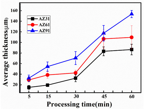 Average thickness of the coated sample (AZ31, AZ61, AZ91) obtained over different processing times.