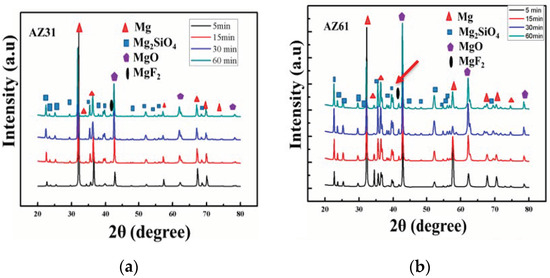 XRD profiles of the coated samples were obtained and are provided in Figure 5a–c. From inspection of the peak profiles, MgO, Mg2SiO4, MgF2 and Mg phases are present in the coatings. Intensities of all phases can be seen as varying both with Al-contents and processing times. The MgF2 peaks obtained at 39°–41°, as indicated by arrows; the lowest intensity was for AZ31; the highest value for AZ91. Fluoride-based (MgF2) content in the coatings suggests a PEO process with high current density verified for AZ91. Similarly, the Mg peaks obtained at shorter processing times have higher intensity; however Mg peaks at ~62° are barely present for AZ91 (~max Al). The intensity of the Mg peaks at ~36° can be seen as highest for AZ31, suggesting higher Mg contents and lower thickness values. In the case of Mg peak at ~57° has varying trends with processing times and Al content. For instance, the Mg peaks in AZ31 demonstrate a linear decreasing trend with processing time. However, they remained until the final processing conditions. The intensity of the Mg peaks, however, decreased very sharply for AZ61 and AZ91, and were found to have completely disappeared under final processing conditions for AZ91. Relationships of the intensities of the signals for the Mg versus Mg2SiO4 samples can also be clearly observed in Figure 5d.