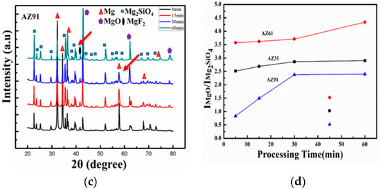(a–c) XRD profile of the coated sample (AZ31, AZ61, AZ91) obtained at different processing times. (d) Intensity relationship of the MgO/Mg2SiO4 sample ratio.