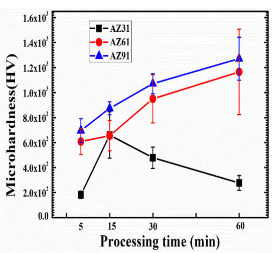 Average micro-hardness of the coated sample (AZ31, AZ61, AZ91) obtained at different processing times.