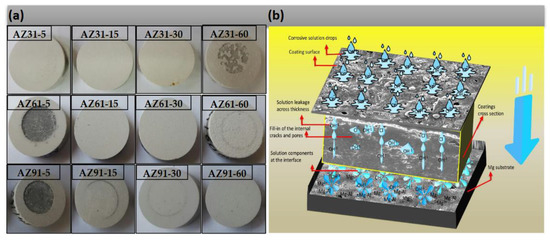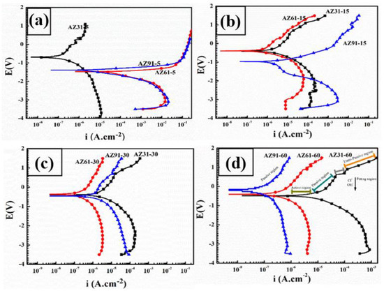 During the anodic part of the potentiodynamic polarization, ions (Cl− and OH−) commence penetration through the thick coatings, as shown in Figure 8b. However, they are obstructed randomly by the intermediate layer and deposit where the layer has cavities at the same time as Mg2+ migrates toward the surface, which is obstructed by the barrier layer. The initial signals obtained from the ionic transfer correspond to the active region on the Tafel curve as shown in Figure 7d. With a further increase in voltage toward the anodic side, the ions present in the weaker spots, (impurities, pores, cracks, porous spots etc.) and at the interface zone, could arrange to form thin films, e.g., of the nature, MgOH2, Mg-Al(OH)2+x, Al(OH)3, MgCl2, Mg-Al(Cl)2+x, and AlCl3. Depending upon the availability of both type of these ions, as disciplined by the coatings thickness, composition of the coating (i.e., MgO, MgF2, etc.) layers, and microstructures (dendrite-crater structure etc.) of the coating layers, these corrosion inhibiting layers play a vital role in blocking the impending ionic transfer and thus current signaling. The aftermath variation in the corrosion current could lead to either passivation or pseudo-passivation. Alternatively, the active corrosion region can be elaborated as determined from the polarization Tafel plots as shown in Figure 7a–d. Various mechanisms of the corrosion process during the dissolution of the samples, as shown in Figure 8b, were correlated with the part of the Tafel, such as (a) active regions, (b) metastable regions, and (c) trans-passive or pseudo-passive regions. It can be seen that, in the case of AZ91-60, the passive region is extended during the over-potential process. The highest resistance to the corrosion potential of AZ91-60 in the passive region can also be attributed to the existence of β-phase in the barrier layer, with oxidation potential (~1.3 V), ~0.3 V, higher than α-phase (~1.6 V) in NaCl solutions as reported by Song et al. [53,54].