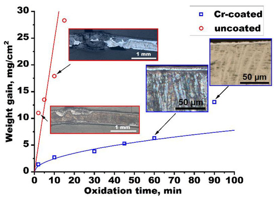 The dependencies of the weight gain of uncoated and Cr-coated LBW samples on oxidation time are shown in Figure 1. The weight gain of uncoated samples is significantly higher than that of Cr-coated samples. The crucial role of Cr coating on weight gain of Zr alloys under high-temperature oxidation was earlier observed in [11,25]. Thus, the deposition of Cr coatings increases the oxidation resistance of LBW Zr alloy samples by 5.7 and 6.6 times after 2 and 10 min oxidation, respectively.