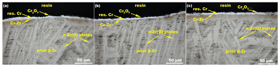 OM images of the cross-section microstructure of the Cr-coated LBW sample after 90 min oxidation in a surface region of WZ (a), HAZ (b), and bulk (c) zones.