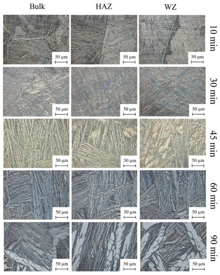 Figure 3 shows the optical images (OM) of the cross-section microstructure of the Cr-coated LBW E110 alloy for each zone depending on oxidation time. After oxidation, a Widmanstetten microstructure consisting of α-Zr and/or α-Zr(O) plates embedded in primary β-Zr grains was formed in each zone. At up to 30 min oxidation, the microstructure of WZ and HAZ is similar to the microstructure of the initial LBW samples before oxidation, where α-Zr plates formed as a result of fast cooling from β-Zr phase during laser welding [19]. At longer oxidation, the formation of α-Zr(O) plates inside the LBW alloy was observed. The growth of these plates is caused by the diffusion of oxygen through the Cr coating and its dissolution in the β-Zr phase with subsequent stabilization of the α phase. The α-Zr(O) plates are interlaced between each other and mainly oriented transversely to the sample surface. The average thickness of α-Zr(O) plates increases from 3 to 25 μm as the oxidation time increases from 30 to 90 min, respectively.