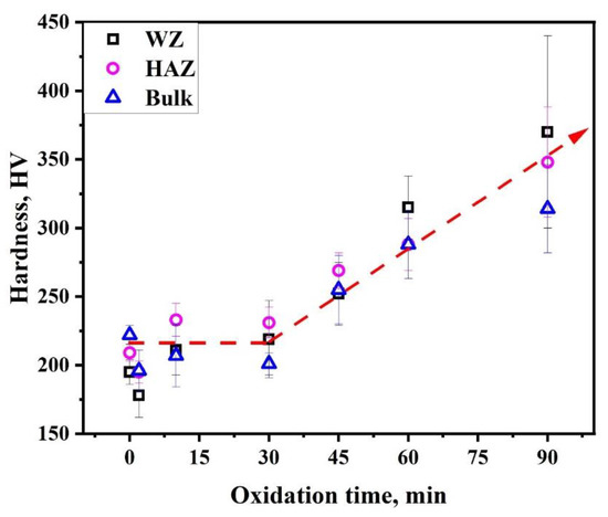 The opposite behavior of hardness was found for Cr-coated LBW samples. Figure 4 presents dependencies between the hardness of Cr-coated samples and oxidation time for different zones (WZ, HAZ, and bulk). The obtained data indicate no significant changes in the hardness up to 30 min oxidation and then, for longer oxidation time, hardness increases. It is well seen that the hardness in WZ, HAZ, and bulk zones increases from 220, 230, and 200 to 370, 350, and 315 HV, respectively. Hardening of the Cr-coated LBW samples is mainly caused by the formation and growth of the oxygen-stabilized α-Zr(O) plates which can have 894–974 HV hardness [30]. These results are well correlated with the cross-section microstructure data (Figure 3). Moreover, it is also found that the hardness in the bulk increases slowly than in WZ and HAZ that is caused by lower thickness of α-Zr(O) plates (~17 µm in bulk zone).