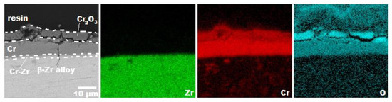 Cross-section SEM image of the Cr-coated LBW E110 alloy sample after 45 min oxidation and corresponding EDS maps of Zr, Cr, and O.