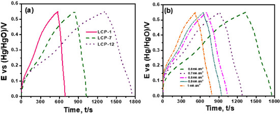 FE-SEM images of LCP-1, LCP-7, LCP-12; (a,b) galvanostatic charge-discharge capacitance comparison. LCP-1 fabricated from the solution with the pH = 1; LCP-7 fabricated from the solution with the pH = 7; LCP-12 fabricated from the solution with the pH = 12) [29].