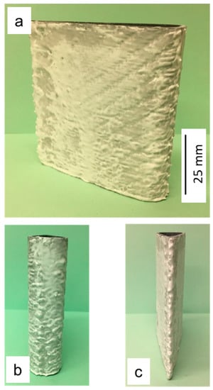 A combination of spin and dip (spin–dip) was another method used to apply EBC on a sintered SiC airfoil and CVI CMC airfoils (75 mm high × 75 mm wide and 25 mm high × 75 mm wide) (Rolls-Royce High Temperature Composites, Cypress, CA, USA). The airfoil is a generic airfoil with a symmetric tear drop shape. The key components of the spin–dip apparatus are a spinning rod, an airfoil attachment fixture, and a slurry container. The spinning rod can simultaneously spin and move vertically using two mechanical motors. The attachment fixture prevents the slurry from infiltrating the inside of the airfoil. The EBC application sequence is as follows: (1) attach an airfoil to the spinning rod using the fixture; (2) fill the slurry container with bond coat composition slurry; (3) lower the airfoil into the slurry bath at 5 mm/s; (4) spin the airfoil at 60 rpm for 30 s after the airfoil is completely dipped in the slurry; (5) raise the airfoil from the slurry bath at 5 mm/s while spinning at 60 rpm; (6) increase the spinning speed to 500 rpm once the airfoil is completely out of the slurry bath to remove the excess slurry until the slurry coating is dry; (7) repeat the steps (3) through (6) for the desired number of preselected dips in order to achieve the target sintered bond coat thickness, which was 75 μm for this application; (8) dry the coated part overnight in ambient air; (9) sinter the coated part per the sintering steps described below; (10) repeat steps (1) through (9) using a slurry with the top coat composition (target sintered top coat thickness = 75 μm). Figure 3a, Figure 3b and Figure 3c, respectively, show a flat side, the leading edge, and the trailing edge of the EBC-coated CMC airfoil.