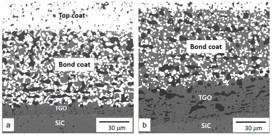 Figure 5a,b are low and high magnification cross-sectional images, respectively, of an EBC-coated SiC heating element after 100 h exposure, and Figure 5c,d show similar magnified views after 500 h exposure at 1427 °C in 90 vol.% H2O + 10 vol.% O2. For comparison, Figure 6a,b are cross-sections of a coated sintered SiC after 100 h and 500 h, respectively, at 1427 °C in 90 vol.% H2O + 10 vol.% O2. The SiC heating element was rectangular in shape and highly porous. The coating was thinner around the corners because the slurry tended to flow away from the edges and protrusions due to the relatively low viscosity (~15 to 20 centipoise). Most pores near the surface of the element were partially infiltrated by the slurry, indicating that the pores were mostly interconnected. The bond coat had three distinct components according to EDS: Yb2Si2O7 (white areas), SiO2 (gray areas), and pores (dark areas). The silicon sintering aid transformed to SiO2 via oxidation during sintering and subsequent oxidation testing. The top coat (Yb2Si2O7) had no SiO2 phase and was denser than the bond coat.