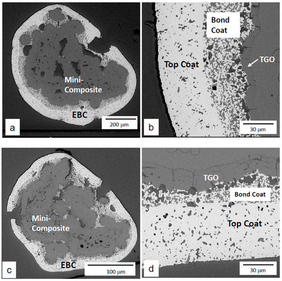 Figure 7a,b show low and high magnification cross-sections of a mini-composite after 100 h, respectively, and Figure 7c,d show cross-sections collected after 300 h at 1427 °C in 90 vol.% H2O + 10 vol.% O2. The bond coat exhibited a greater amount of variability in thickness, primarily due to the irregular shape of the mini-composite and its contoured surface (~13 to 50 μm, with the average thickness of approximately 30 μm). The EBC top coat had a fairly uniform thickness (45 to 60 μm), with the variation again attributed to the shape of the mini-composite. Some areas were not fully covered with the coating, which was due to the line-of-sight nature of the spray coating coupled with the irregular shape. Oxidation was more severe on areas with an incomplete EBC coverage, supporting the efficacy of EBC in mitigating oxidation. The TGO thickness at 100 h and 300 h was 6.13 ± 1.13 μm (Table 2) and 16.56 ± 1.94 μm (Table 2), respectively, which is in line with the reported TGO thickness on the CVI CMC coated with the same EBC (Table 2) [16].
