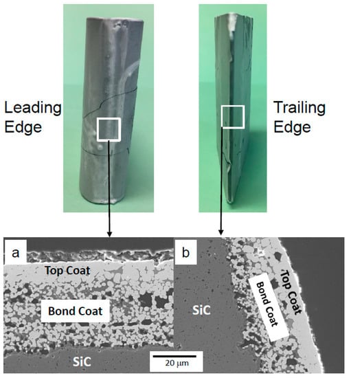 Cross-sectional evaluations were conducted on one 75 mm × 25 mm spacer. Figure 10a–c show, with increasing magnifications, the cross-section of the area between the leading edge and the flat surface. Cracks were observed at the bond coat/CMC interface (Figure 10c), but the cracks grew narrower towards the flatter surface (Figure 11a), completely disappearing near the flat surface (Figure 11b). An analytical model of the TBC (thermal barrier coating) residual stresses on a cylindrical substrate showed that the TBC tensile radial stress increased with the decreasing radius of curvature [26]. According to this study, the maximum radial tensile stress increased by about 65% when the radius of curvature decreased by a factor of four. The cracks near the leading edge and the gradual narrowing and eventual disappearance towards the flat surface is thus attributed to the effect of the radius of the curvature on residual stresses. The TGO was very thin (~1 to 2 μm) due to the short oxidation time (50 h) and the cooler temperatures than the hot gas path. Figure 12a,b show a low and high magnification cross-section of a flat area near the trailing edge. There were no cracks at the bond coat/CMC interface, consistent with the effect of the radius of the curvature on residual stresses.