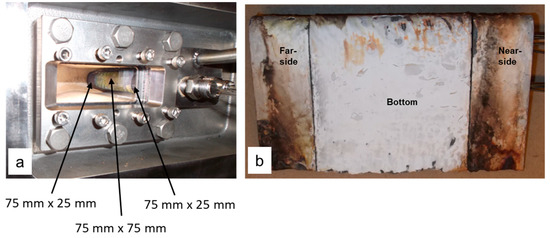 Three EBC-coated CMC airfoils (one 75 mm × 75 mm and two 75 mm × 25 mm) were tested in the Pratt and Whitney high pressure thermal cycling (HPTC) rig. For the 75 mm × 75 mm airfoil, the test temperature and duration were 5 h (50 cycles total) at 1354–1400 °C, followed by 5 h(50 cycles total) at 1354–1432 °C and 5 h(50 cycles total) at 1416–1538 °C. The test condition was P(H2O)~0.82 atm, Ptotal~8.2 atm, v~116 m/s, and the estimated ΔT (temperature gradient) through the entire system (EBC + CMC) was ~100 °C–150 °C (See Table 1). Figure 9 shows a picture of the three airfoils installed in the rig test section and the three post-test CMC airfoils. The 75 mm × 75 mm airfoil was sandwiched between the two 75 mm × 25 mm airfoils. The two 75 mm × 25 mm airfoils were used as spacers to seal the gap between the 75 mm × 75 mm airfoil and the inner and outer wall of the test section. The 75 mm × 25 mm CMC airfoils had an identically processed EBC on the surface and experienced three times longer exposure (50 h (500 cycles total)) because the spacers were used in conjunction with other CMC airfoil tests. The outer edge of each spacer (in contact with the chamber wall) was cooler than the other edge in contact with the 75 mm × 75 mm airfoil; however, the exact temperature distribution on the spacers was not measured. The two spacers were swapped between the two slots every few hours.
