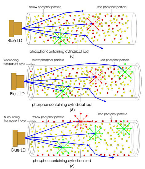 To overcome the limitations of the phosphor-coated, cylindrical-rod-based extended white light source, a cylindrical rod containing yellow phosphor for laser-driven white lighting was evaluated in this study, as displayed in Figure 1a. Without the use of a focal lens, the blue light emitting from the LD with limited divergence enters the cylindrical rod and excites the yellow phosphor particles in the cylindrical rod to generate white light. The scattering of the yellow phosphor in the cylindrical rod results in the scattering of the blue and yellow light propagating in the rod, thereby resulting in uniform illumination [18,19]. Thus, the additional grinding and drilling of the cylindrical rod are ignored. The yellow phosphor with different phosphor concentrations that distributed uniformly in the cylindrical rod was investigated to determine the output power and correlated color temperature (CCT) of laser-driven white lighting. However, the scattering of the yellow phosphor in the cylindrical rod may also prevent the blue light from the LD from exciting the phosphor particles away from the LD when the phosphor concentration is high. Without the blue light excitation, the yellow emission and output power of the region in the cylindrical rod away from the LD would be low. To enhance the possibility of blue light absorption by yellow phosphor in the cylindrical rod region away from LD, a surrounding transparent layer around the central cylindrical rod was investigated, as illustrated in Figure 1b. The surrounding transparent layer redirects the blue light exiting the central cylindrical rod through TIR to the region away from the LD and then increases the possibility of blue light absorption by yellow phosphor in the central cylindrical rod. Another problem of laser-driven white light is its high CCT. Similar to the light emitted by pc-LEDs, the laser-driven, phosphor-converted white light is based on the integration of traditional broadband yellow phosphors and blue LD. However, the laser-driven, phosphor-converted white light emitted by yellow phosphor is not suitable for medical examination lighting or operating lights because of the poor performance in the red part of the spectrum and the corresponding high CCT. Multiple phosphor blends with yellow and red phosphors could be used in laser-driven, phosphor-converted white light to enhance the red luminescence of white light with a low CCT. Therefore, we characterized the cylindrical rod containing both yellow and red phosphors for laser-driven white lighting in this study, as illustrated in Figure 1c. We also investigated the surrounding transparent layer around the cylindrical rod containing both yellow and red phosphors, as illustrated in Figure 1d. However, experimental observations revealed that multiple phosphor blends reduce the luminescence of individual phosphors and their corresponding luminous efficiency due to the reabsorption of light in pc-LEDs [20,21]. For the cylindrical rod containing yellow and red phosphors for laser-driven white lighting in this study, the structure may also exhibit low luminous efficiency due to the reabsorption of light in the structure. Therefore, certain photons emitted from yellow phosphor are absorbed by red phosphor particles in the same structure before they are extracted from the device. We propose a phosphor design involving a surrounding red phosphor layer in which yellow and red phosphors are separated for use in laser-driven white lighting. The yellow cylindrical rod and surrounding red phosphor layer are then separately illuminated by blue light emitted from the blue LD, as displayed in Figure 1e.
