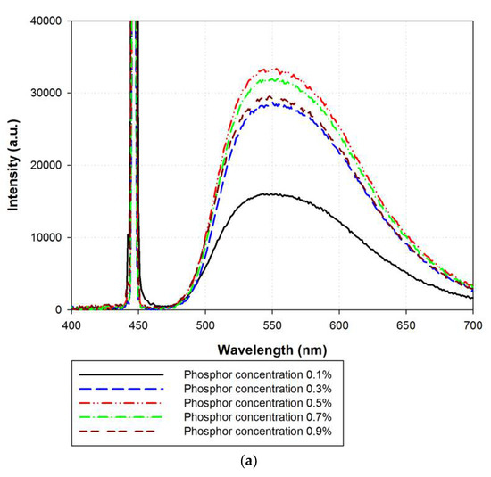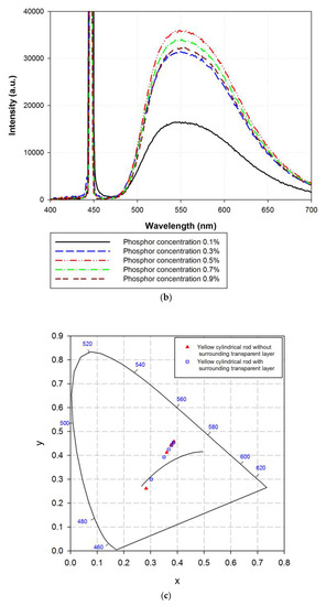 Table 1 summarizes the optical characteristics of the cylindrical rod containing yellow phosphor with or without the surrounding transparent layer at different phosphor concentrations. The luminous fluxes of the cylindrical rod containing yellow phosphor with or without the surrounding transparent layer initially increased with the phosphor concentration and then decreased. Thus, a threshold yellow phosphor concentration was present. The human eye is more sensitive to yellow emission than to blue light, and a yellow cylindrical rod with a higher phosphor concentration exhibits a higher luminous flux, as depicted in Figure 4a,b. For yellow phosphor concentrations greater than the threshold concentration, the high scattering of phosphor prevents the yellow light emitted from the phosphor particles from escaping the yellow cylindrical rod with more phosphor particles, resulting in a decrease in the output luminous flux. Meanwhile, the luminous fluxes of the yellow cylindrical rod with the surrounding transparent layer were higher than those without the transparent layer. The surrounding transparent layer redirects the blue light exiting the central cylindrical rod because of the TIR to the region away from the LD and then increases the possibility of the blue light absorption by yellow phosphor and the output power of the cylindrical rod. Furthermore, the CCTs of the cylindrical rod containing yellow phosphor with or without the surrounding transparent layer decrease with the increasing phosphor concentration. The increase in the blue laser light absorption and yellow emission from the yellow cylindrical rod was responsible for the decrease in the CCT with increasing phosphor concentration. However, the trend of the decrease in CCT with phosphor concentration is different from the decrease in yellow emissions, as illustrated in Figure 4a,b. The yellow emissions of the cylindrical rod containing yellow phosphor with or without the surrounding transparent layer initially increased with the phosphor concentration and then decreased. The high phosphor scattering prevents both the blue and yellow light from escaping the yellow cylindrical rod with more phosphor particles, resulting in a decrease in the blue and yellow emissions when phosphor concentration is high. This, in turn, leads to a decreasing CCT of the cylindrical rod containing yellow phosphor with or without the surrounding transparent layer with increasing phosphor concentration. The chromaticity coordinates of the cylindrical rod containing yellow phosphor with or without the surrounding transparent layer are displayed in Figure 4c. The CCT decreased from 11,590 to 4276 K for the yellow cylindrical rod without the surrounding transparent layer and from 7902 to 4292 K for the yellow cylindrical rod with the surrounding transparent layer.