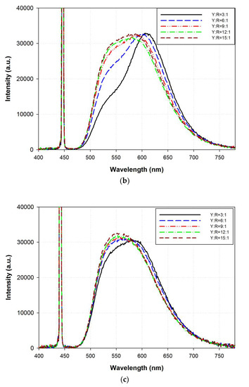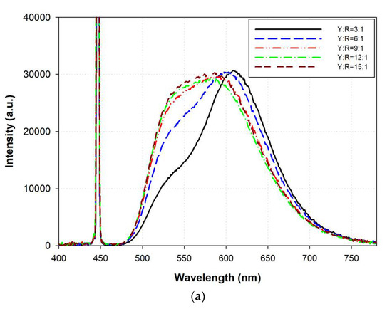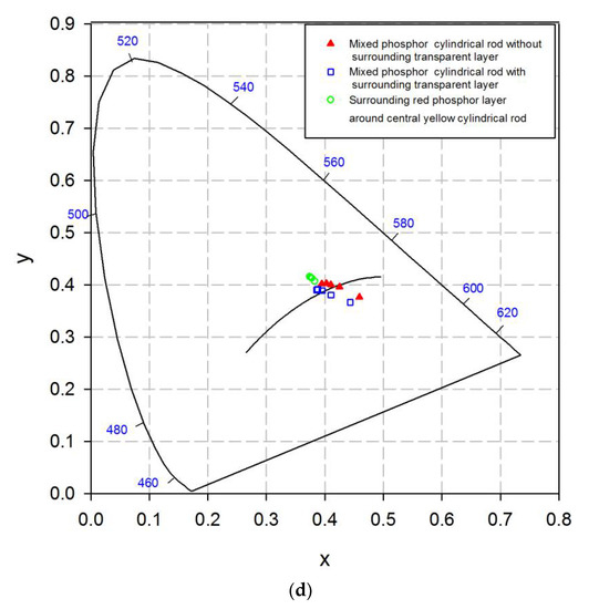 Table 2 summarizes the optical characteristics of the cylindrical rod containing both the yellow and red phosphors with or without the surrounding transparent layer and the surrounding red phosphor layer around the central yellow cylindrical rod with different Y:R ratios. At a yellow phosphor concentration of 0.5%, the CCTs of all the structures containing both yellow and red phosphors were lower than those of the cylindrical rod containing only yellow phosphor. The enhancement in the red emission of the cylindrical rod structure containing red phosphor resulted in white light emission with a low CCT. With the increasing Y:R ratios for the cylindrical rod structure, the CCT increases in the cylindrical rod containing both yellow and red phosphors with or without the surrounding transparent layer. The increase in the Y:R ratios indicates an increase in yellow phosphor weight with a corresponding decrease in red phosphor. Thus, the red emission from the red phosphor is low when the Y:R ratio is high. Furthermore, the CCT of the cylindrical rod containing both yellow and red phosphors with a high Y:R ratio was high. Moreover, the quantum yield of the red phosphor was lower than that of the yellow phosphor. In addition, the cylindrical rod containing less red phosphor (or high Y:R ratio) can cause high yellow emission with corresponding high-output power, as illustrated in Figure 5a,b. Thus, the luminous flux increases with the increasing Y:R ratio for the cylindrical rod containing both yellow and red phosphors. However, the luminous fluxes of the yellow cylindrical rod with the surrounding transparent layer were higher than those of the rod without the transparent layer. The surrounding transparent layer redirects the blue light escaping the central cylindrical rod because of the TIR to the region away from the LD and then increases the possibility of blue light absorption by the yellow and red phosphors and the output power of the cylindrical rod. Compared with the cylindrical rod containing both yellow and red phosphors with or without a transparent layer, the red phosphor layer surrounding the central yellow cylindrical rod yielded high luminous flux at different Y:R ratios. With the decrease in reabsorption in the two phosphor systems, the surrounding red phosphor layer around the central yellow cylindrical rod yielded a high luminous flux. However, most of the light emitted by the blue LD hit the yellow phosphor particles in the central yellow cylindrical rod; only part of the blue light emitting from the LD or scattered by the yellow phosphor particles hit the red phosphor particles in the surrounding red phosphor layer. The low divergence angle of the blue LD causes the low possibility of the blue light hitting the red phosphor particles in the surrounding red phosphor layer. Thus, the red emission observed in the surrounding red phosphor layer was negligible around the central yellow cylindrical rod, as illustrated in Figure 5c. Figure 5d illustrates the low variations in chromaticity coordinates and CCT of the surrounding red phosphor layer around the central yellow cylindrical rod with different Y:R ratios. The chromaticity coordinates of the cylindrical rod containing both yellow and red phosphors with or without the surrounding transparent layer changed from natural white to warm white, which were in close proximity to the Planckian locus, as displayed in Figure 5d. The CCT increased from 2263 to 4089 K for the cylindrical rod containing both yellow and red phosphors without the surrounding transparent layer and from 2493 to 4524 K for the phosphors with the surrounding transparent layer.