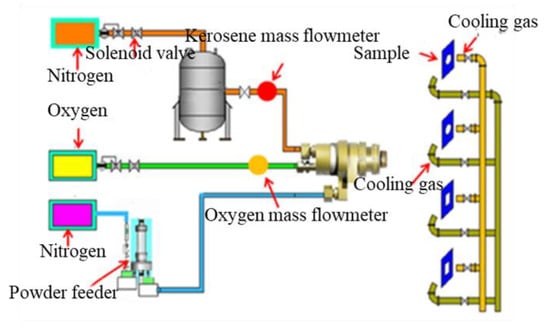 Figure 1 shows the static service simulation device used for SPE tests of TBC. This device can be divided into the following main systems: (1) the feeding system, including nitrogen gas source, oxygen gas source, kerosene system, and powder feeder; (2) the mobile supersonic spray gun, which is the main part of the whole simulation device; (3) the sample platform, which is equipped with a cooling device for sample cooling; (4) test control system. During the SPE tests, kerosene was used as fuel and was mixed with oxygen in the pipeline. A high-temperature and high-speed flame flow mixed with solid particles was sprayed from the spray gun on the sample to simulate the SPE condition. The erosion angle between the flame flow and sample surface can be adjusted by rotating the sample holder. The SPE tests were conducted at the angles 90° and 60° between the flame flow and the sample surface to investigate the effect of erosion angle on the SPE behavior of TBC.