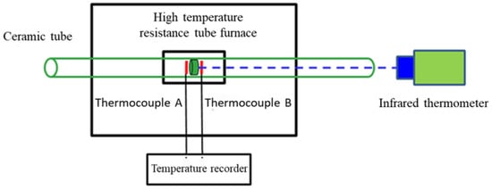 The temperature of the sample surface was measured by an infrared thermometer in the static service simulation device. The emissivity of the sample significantly influences the accuracy of temperature measurement by the infrared thermometer. The emissivity is not only related to the material but also to the temperature. Therefore, it is necessary to measure the emissivity of TBC before the SPE experiment to ensure the accuracy of the experimental temperature obtained by infrared thermometer. Figure 2 shows the primary process of infrared emission calibration by testing the temperatures at both sides of the sample by thermocouples A and B. Table 1 lists the infrared calibration data. Eventually, the emissivity of the sample was determined as 0.88 by calibration test.