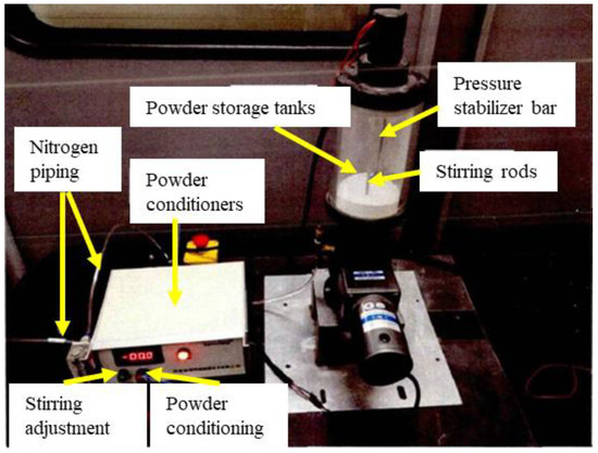 The powder feeder in this paper is type IGS-3W (Aigang, Zhengzhou, China), which can control the powder flow steadily and precisely. The powder feeder is shown in Figure 3 and mainly consists of two modules: the powder regulator and the powder storage tank. It also includes a powder regulator knob, a stirring regulator knob, and a gas flow meter. The upper interface of the gas flow meter is connected to the nitrogen gas through a pipe, and the lower interface is connected to the powder storage tank through a pipe to provide pressure for the storage tank. The powder storage tank is used to store the powder for experiments. Inside the tank, there is a stirring bar with a spiral tip to maximize its ability to stir the powder. The top of the bar is connected to an electric motor to provide power to stir the powder in the tank continuously. The speed of the stirring bar is controlled via a regulator stirring adjustment knob to meet the powder flow parameters required in this experiment. The powder adjustment knob on the powder regulator controls the speed of the motor below the powder storage tank to control the powder feed flow. The powder feeder works on the principle that nitrogen enters from the side of the powder reservoir and flows out of the top of the tank via a nitrogen passage rod in the tank. Under the action of the motor and stirring rod, the powder in the reservoir enters the powder feeder pipeline in a steady and precise manner. It is eventually ejected with the flame stream of the gun onto the surface of the sample.