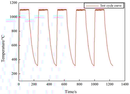 The whole SPE test process is as follows: (1) clamp the coated sample (how the circular sheet sample was clamped is shown in Figure 4); (2) shock the sample with solid particles mixed with high-temperature and high-speed flame flow; (3) turn off the flame spray gun when the temperature of sample surface reaches 1100 °C and is maintained for 120 s; (4) cool down the sample in the external environment for 130 s; (5) repeat step (3) and step (4) until the peeling area of the coating is larger than 10% of the sample surface area; (6) stop the test. Figure 5 shows the temperature curve of the sample surface measured by an infrared thermometer during the SPE test. In order to figure out the influence of high-temperature SPE on the cyclic life of TBC, a series of control experiments were designed and conducted in this study, in which the samples were only subjected to thermal shock at high temperatures without erosion.