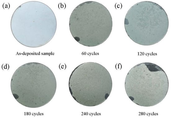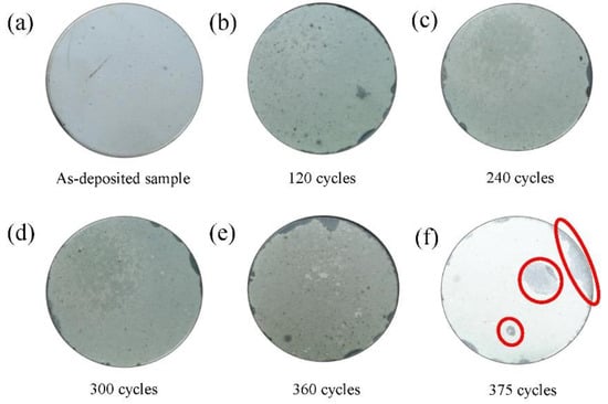 Figure 6 shows the macroscopic photos of the TBC-coated circular sheets after high-temperature SPE tests for different cycles at an erosion angle of 90°. After 120–360 cycles (Figure 6b–e), the thickness of TBC on samples significantly decreases with test cycles, and coating spallation occurs at the edge regions of the circular sheets. With the increase in erosion cycles to 375 (Figure 6f), in addition to the edge regions, two spallation areas appear on the inner side of the sample surface (see inside the red circles). This type of surface spallation is caused by the continuous particle erosion of the sample. The calculation results indicate that the surface peeling area has reached 10% of the whole surface area, and as a result, it can be determined that the TBC has failed.