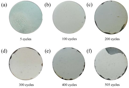 For comparison with the SPE tests of the TBC-coated samples, when the samples only suffered thermal shock, the service life of the TBC increased to 505 cycles and 400 cycles at the impact angles of 90° and 60°, respectively. The macroscopic morphology evolution results during thermal shock are shown in Figure 8 (impact angle 90°) and 12 (impact angle 60°). The failure mechanism of TBC under thermal shock is quite different from that under SPE. When only suffering thermal shock, on the one hand, the coating spallation occurs at the edge region of the circular sheet (Figure 8c–f and Figure 9b–f); on the other hand, the TBC thickness decrease at the inner surface can hardly be observed. These results reveal that SPE can effectively impact TBC’s thickness evolution and failure behavior. The effect of impact angle on the service life of TBC in these tests can also be summarized as follows: the smaller the impact angle, the shorter the service life of TBC.