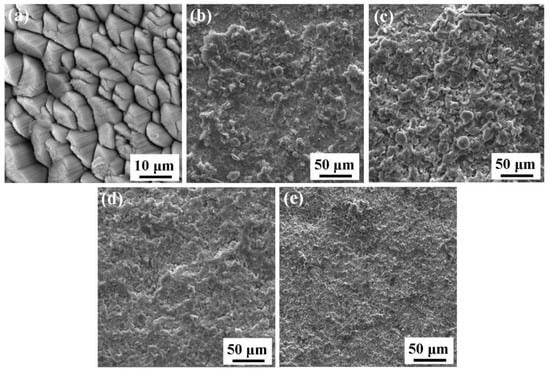 Surface microstructure of TBC before and after tests on circular sheets: (a) as-deposited sample; (b) after SPE at angle 90°; (c) after SPE at angle 60°; (d) after thermal shock at angle 90°; (e) after thermal shock at angle 60°.