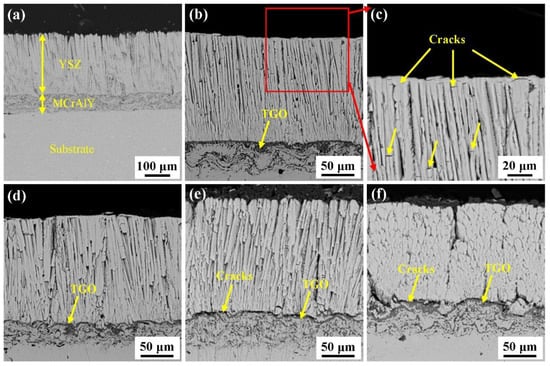 Figure 11 shows the cross-sectional microstructures of the as-deposited TBC and TBC after failure in the SPE and thermal shock tests on circular sheets. As shown in Figure 11a, the as-deposited EB-PVD TBC shows a typical columnar structure without thermally grown oxides (TGO) at the interface between the YSZ TC and the MCrAlY BC. This type of columnar grains is consistent with the surface SEM results in Figure 10. After high-temperature SPE tests (Figure 11b–d) and thermal shock tests (Figure 11e,f), a thin TGO layer formed at the YSZ/MCrAlY interface, which indicates the oxidation of the MCrAlY BC layer. Based on Figure 11c, with a higher magnification at the local region of Figure 11b, after SPE tests at an angle of 90°, many transverse cracks (indicated by yellow arrows) are distributed inside the YSZ grains close to the top surface, and these cracks have divided the columnar grains into several segments. The broken columnar grains should be the reason for the decrease in TBC thickness under the effect of high-temperature SPE. The sample’s microstructure after SPE tests at an angle of 60° (Figure 11d) shows a similar failure mode to that at an angle of 90°. However, when only suffering thermal shock without erosion (Figure 11e,f), horizontal cracks can be observed at the YSZ/TGO interface (indicated by yellow arrows), which can significantly affect the binding force between the outer TC layer and the inner BC layer. The formation of this type of crack should be the failure mechanism of the TBC under thermal shock tests. It is the growth of TGO that led to the formation of cracks between the TC layer and the BC layer.
