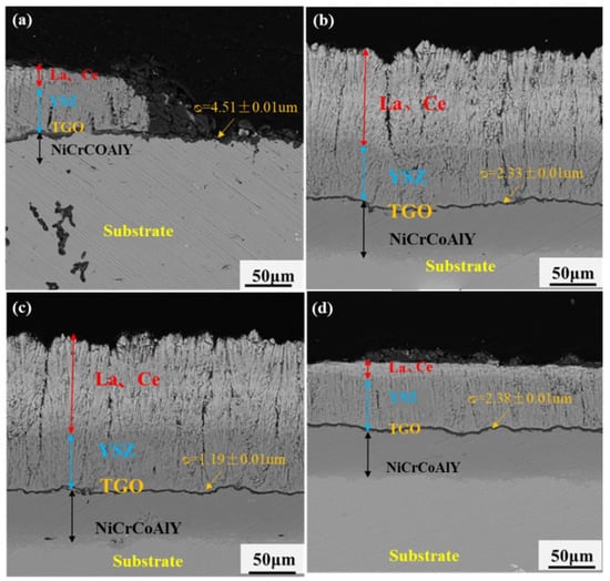The performance of La2Ce2O7-YSZ double-layer TBC under high temperature is more excellent than the conditional single-layer YSZ TBC. Firstly, the thermal expansion coefficient (CTE) of La2Ce2O7 (11.21 × 10−6 K−1) is higher than YSZ (11.08 × 10−6 K−1) at 1100 °C [36], and its CTE is close to the MCrAlY BC layer (13–15 × 10−6 K−1) [37], so the La2Ce2O7-YSZ double-layer TBC can match the metal substrate better at high temperature. Secondly, the thermal conductivity of La2Ce2O7 is significantly smaller than YSZ [38]. Therefore, the temperature at the TC/BC interface of the La2Ce2O7-YSZ double-layer coating should be much lower than that of the YSZ single-layer coating. On the one hand, the growth rate of TGO should be lower at low temperatures; on the other hand, the thermal stress mismatch at TC/BC interface should be smaller. Thirdly, La2Ce2O7 has better mechanical properties at high temperatures [39,40]. All the results by other researchers indicate that the La2Ce2O7-YSZ double-layer TBC shows better thermal shock and thermal cycling resistance than single-layer YSZ TBC [36,40].