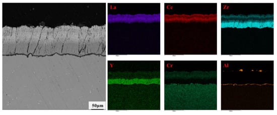 Cross-sectional SEM micrograph and EDS maps of La, Ce, Zr, Y, Cr, and Al of TBC on the trailing-edge region.