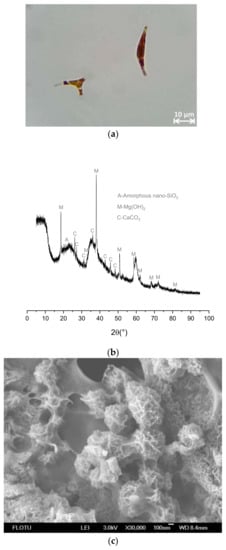 Figure 1a shows the common diatoms contained in seawater (used as mixing water) for the cementitious materials in this study. The name of the diatom is Phaeodactylum tricornutum (strain CCAP 1055/1) (CCAP: the culture collection of algae and protozoa). It can be seen that there are two shapes of this diatom, which is because of the different Si contents in their bodies [,]. Diatoms were ground into powder using a pestle and mortar. The powder was then passed through a sieve of 75 µm. XRD patterns of diatoms were collected using a Bruker D8 powder diffractometer (Bruker, Karlsruhe, Germany) with scanning angles (2θ) ranging from 5° to 95° at a rate of 0.3 s/step and 0.02°/step using a CuKα radiation source (λ = 1.5418 Å) at 40 kV and 40 mA. Figure 1b shows the XRD patterns of a diatom powder sample, and it can be seen that there are a large number of amorphous nano-SiO2 particles at about 20–25 degrees and obvious peaks of well-crystallised nano-CaCO3 and nano-Mg(OH)2. Figure 1c shows the micromorphology of a raw diatom under SEM, which exhibited a rougher and more irregular structure. The diatom powder was gold-coated and then observed under high-vacuum condition using a JSM7401 field emission scanning electron microscope (JEOL, Eching b., München, Germany).