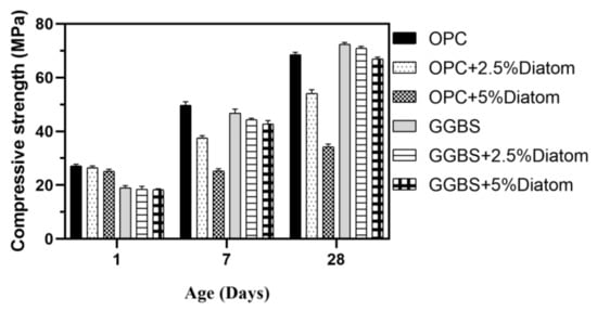 The reduction in compressive strength of cement paste with 5% diatoms can be up to 50.1% in OPC mixes, and this reduction is much lower in GGBS mixes, with only up to 8.6%. This difference was thought to be due to the fact that more ettringites formed in GGBS mixes than in OPC mixes, and the ettringites in the early ages provide bridging effects between separated C-S-H particles, thus partly compensating for the detrimental effects of the weak bonds between C-S-H particles in GGBS mixes.