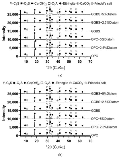 It is noted that there are obvious peaks of Friedel’s salt in all OPC and GGBS mixes with or without diatoms. The existence of high amounts of chlorides provided the reaction to form Friedel’s salt in cement pastes [,,,]. At 1 day (Figure 3a), the effect of different diatom concentrations on the peak heights and peak areas of Ca(OH)2 was not obvious. At 28 days (Figure 3b), in both GGBS and OPC mixes, the peak heights and peak areas of Ca(OH)2 increased gradually with increasing diatom concentrations from 0% to 2.5% and 5%. This could indicate accelerated hydration of C3S by the existence of amorphous nao-SiO2 in the diatoms, to some extent. Figure 3 also shows that the peak heights and peak areas of ettringite in GGBS mixes are higher than in OPC mixes, indicating there could be more ettringite in GGBS mixes. This is caused by the higher amounts of aluminium phases in GGBS than OPC, as shown in Table 1.